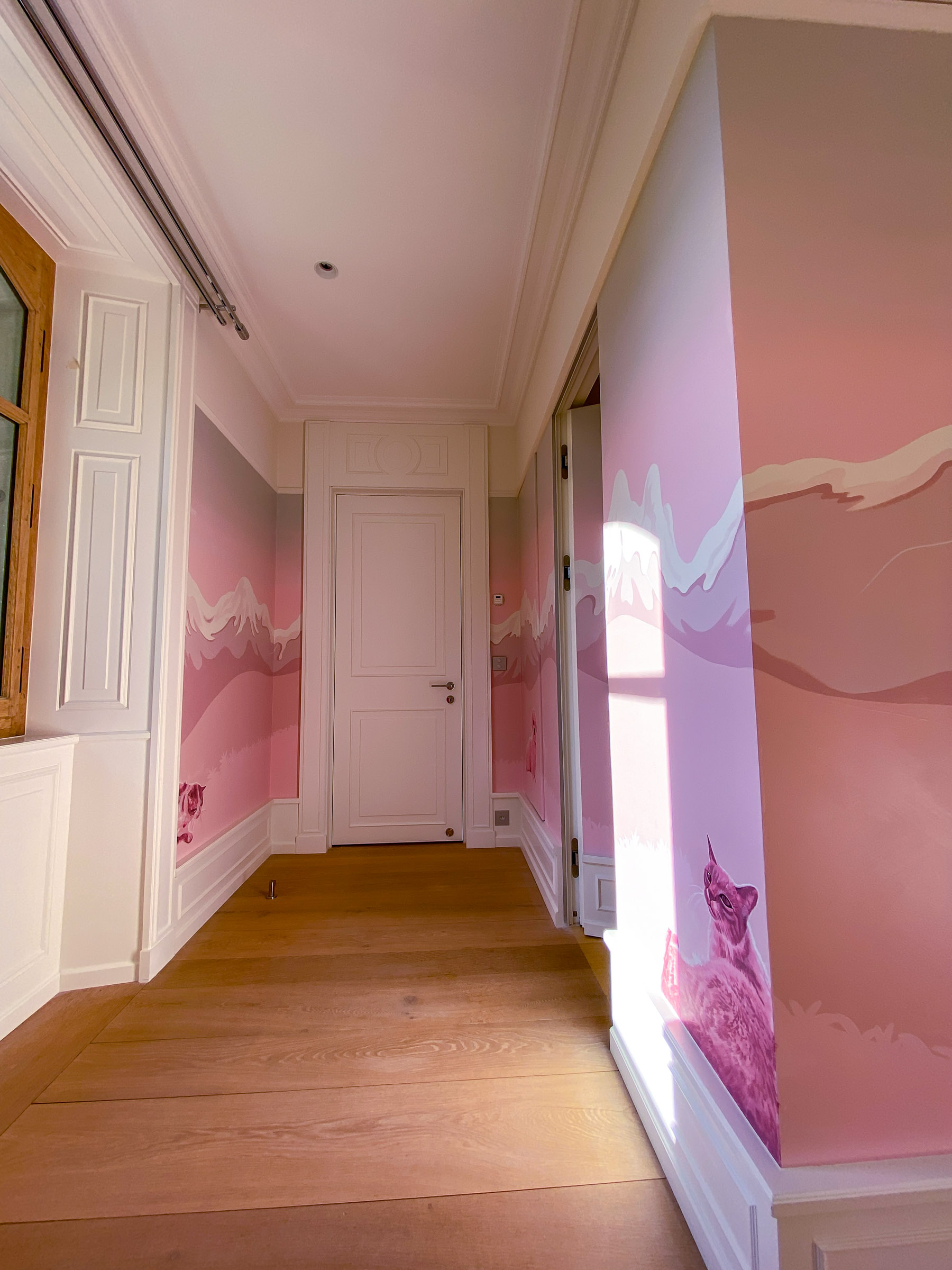 Lovely children's mural in modern grey and pink tones, featuring the client's pets and some stylised unicorns in front of a pretty castle, all set against soft alpine peeks painted in complimentary shades.