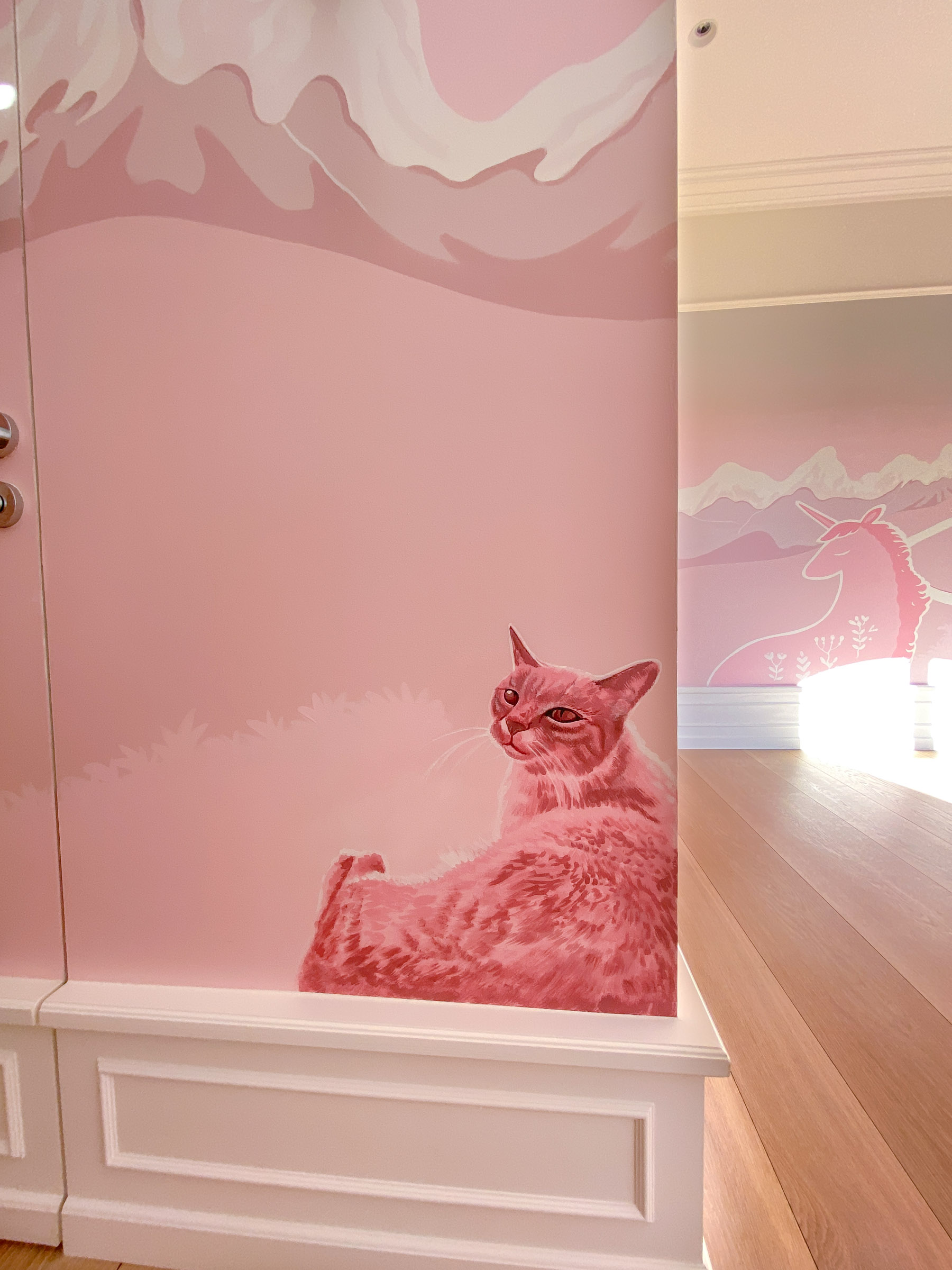 Bedroom mural for client's daughter, showing layered mountain scene and two more of their pets. Door hides the en-suite bathroom