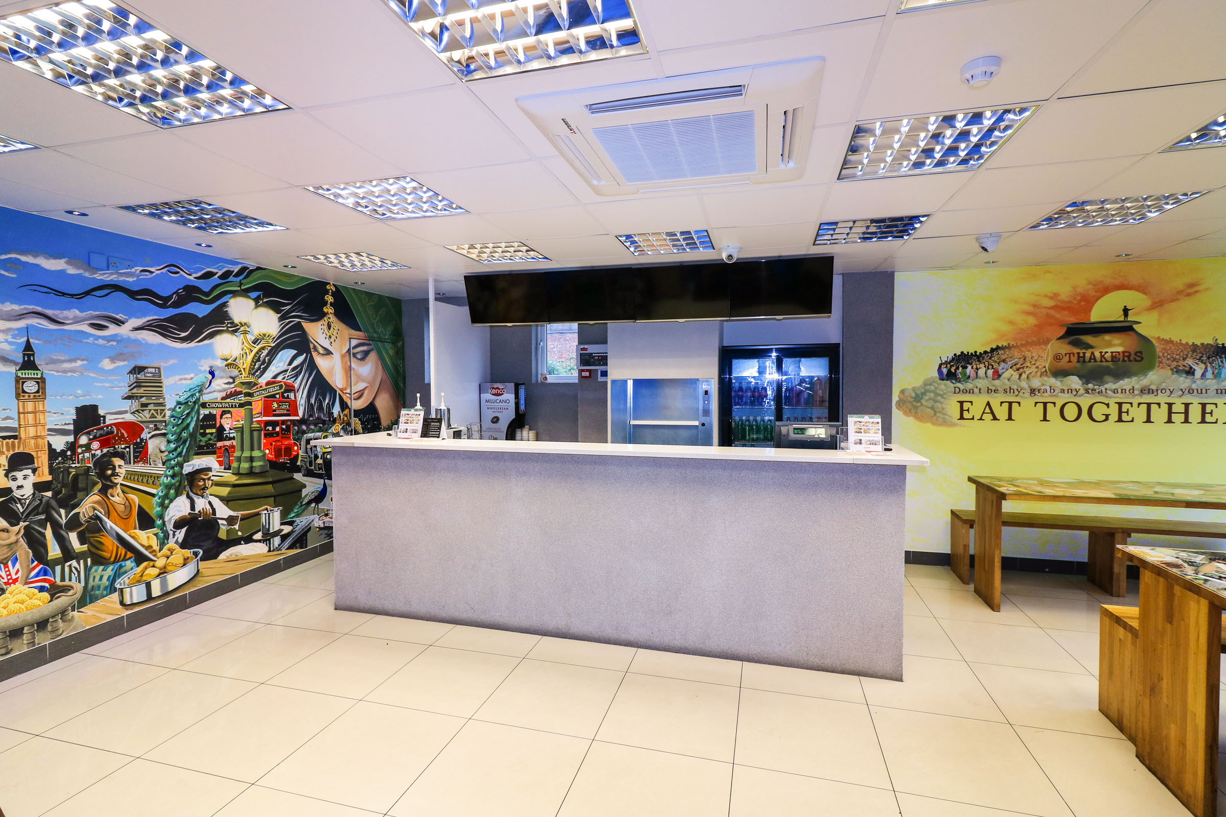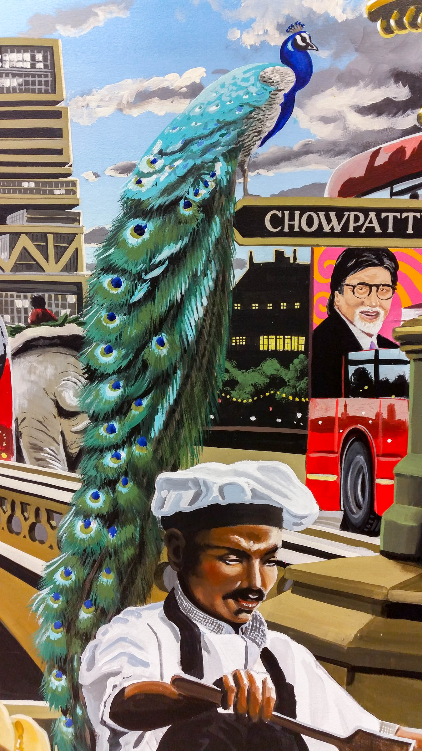Thakers Restaurant Wall MuralThakers Restaurant - Both murals shown in this pic Indian English hybrid muralmural with the doors openThis part of the mural depicts an Indian Goddess filling the skyThis part of the mural shows the organised chaos of an Indian street scene happening in the middle of LondonIndian Fast Food Restaurant MuralAuto Rickshaw tuktuk man and elephant in ceremonial garbMural depicts a moment of reverant peace as lady in sari makes an offering on a Shiva lingumSacred Cow, blocking the road James Bond, the Sean Connery model, and GaneshNod to Banksy, appropriate peace "activist" on the Houses of Parliament, with the silhouetted image making the shape of an Indian God's weaponExtreme Bombay ArchitecturePeacock on the muralAfrican bird as a personal nod to some family historyParliament with added Hindu templeMural shows Indian Street food, puri and dosaGhandi and Chaplin, and Ganesha's RatStreet chefAnother kind of street chefMural painting of Charlie ChaplinMural painting of GhandiMural of Bollywood superstar Amitabh Bachchan on the side of an English Routemaster busPeacock, bus, street vendor, glowing Westminster Bridge street light mural, and Amitabh Bachchan!Bus number - Om, Destination - Love...where the mural lives to the side of the counter. ..and some artist guy ;)