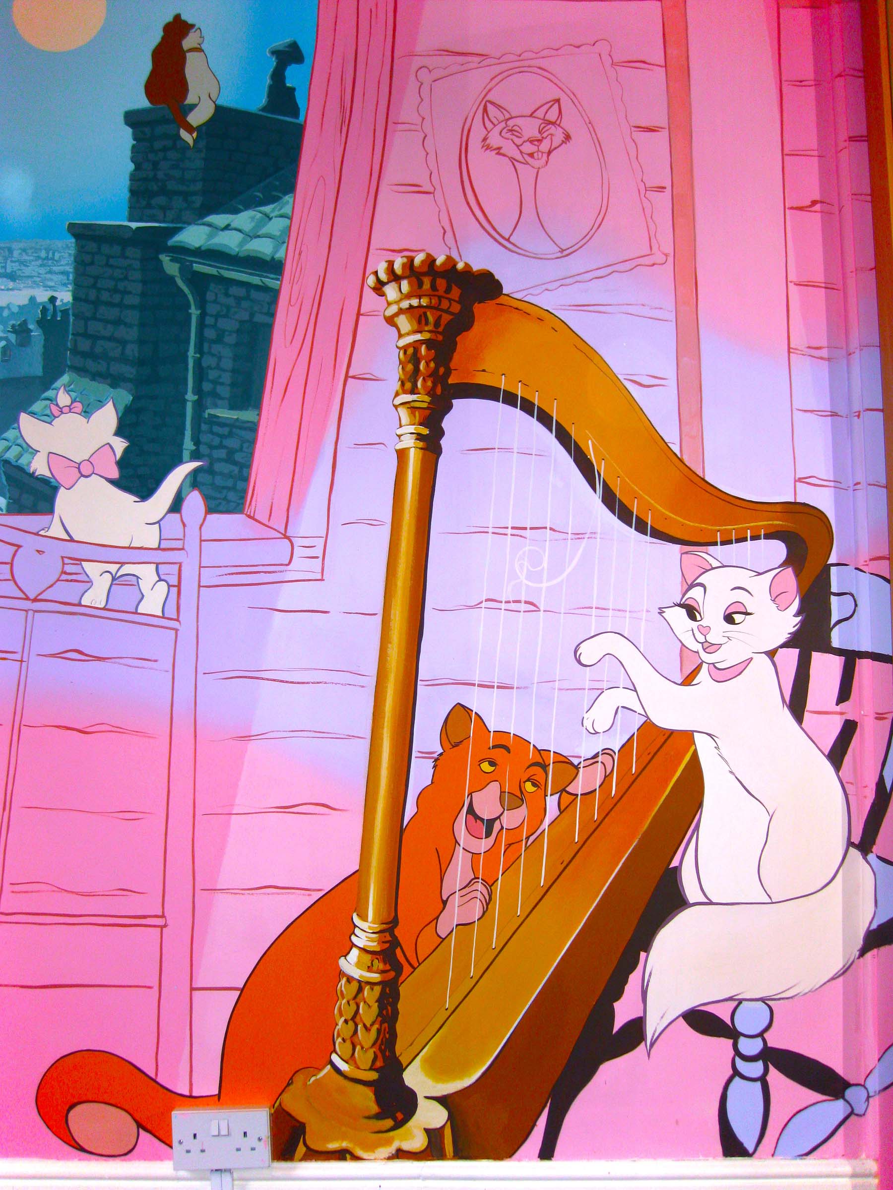 Berlioz, Toulouse and Marie shaking it up in front of Paris by moonlight, which is I think utterly charming.When the Aristocats reach Paris, O'Malley bumps into his ol' pal Scat Cat, so time for some Disney style jazz. This Aristocats mural is painted around the whole roomClose up of the window scene in this bedroom mural, with Berlioz and Toulouse dancing on the windowsill, and Marie catches a romantic moment between Duchess and O'Malley as they stare out over a moonlit Paris.Duchess and O'Malley crooning through the harp stringsToulouse painting portrait of Edgar in this corner part of the Aristocats bedroom.Love this part of the mural, with Toulouse getting messy with paint! part of the Aristocats mural disguises a radiator, and shows Scat Cat and his band, (Shun Gon, Hit Cat, Peppo and Billy bass) jazzing it upEntrance door into the roomAristocats Wall Mural corner with mirrored fitted wardrobesToulouse helping to paint this part of the mural!Aristocats Mural, Scat Cat and his band play "Everybody wants to be a cat""Cluttered" mural corner, some of the background was painted in an outline style as this a) emulated the style of the jazzy scene in the Aristocats movie, and b) saved valuable time.This part has a portrait of Shun Gon, the Chinese catRoquefort doing some detective work'Malley and Duchess on a rooftop in moonlit Paris - The start of a beautiful friendship :)