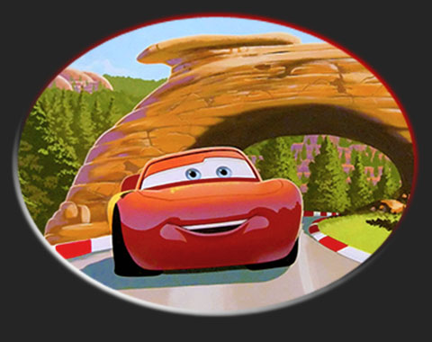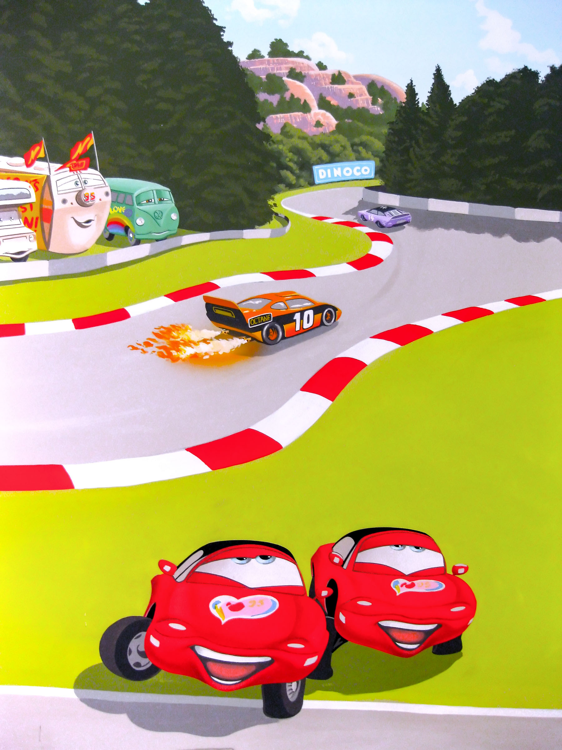 The mural design features many of the film's great characters like Lightning McQueenand Mater also Sally, Doc Hudson, Luigi, Guido, Sheriff, Chick Hicks and many more, plus cameos from Buzz Lightyear and Spiderman. The landscape was designed to look like a cross between the mountains in the Cars movie, and a European race circuit, to bring more green colours into the room. I felt quite honoured to be asked to paint these celebrities' boy's room.
