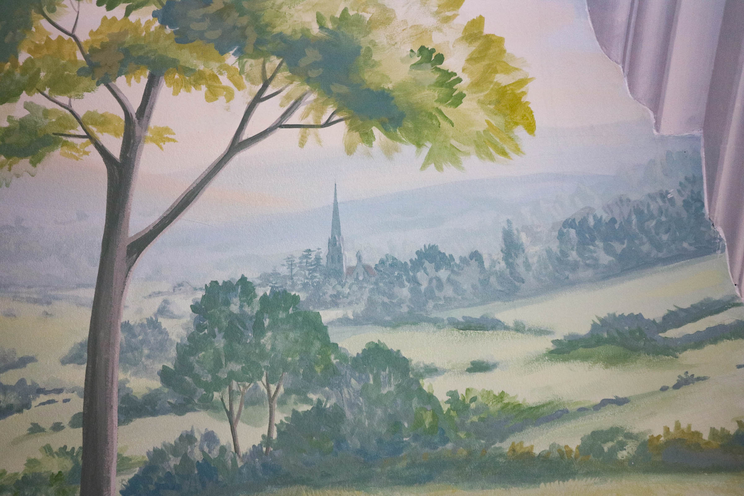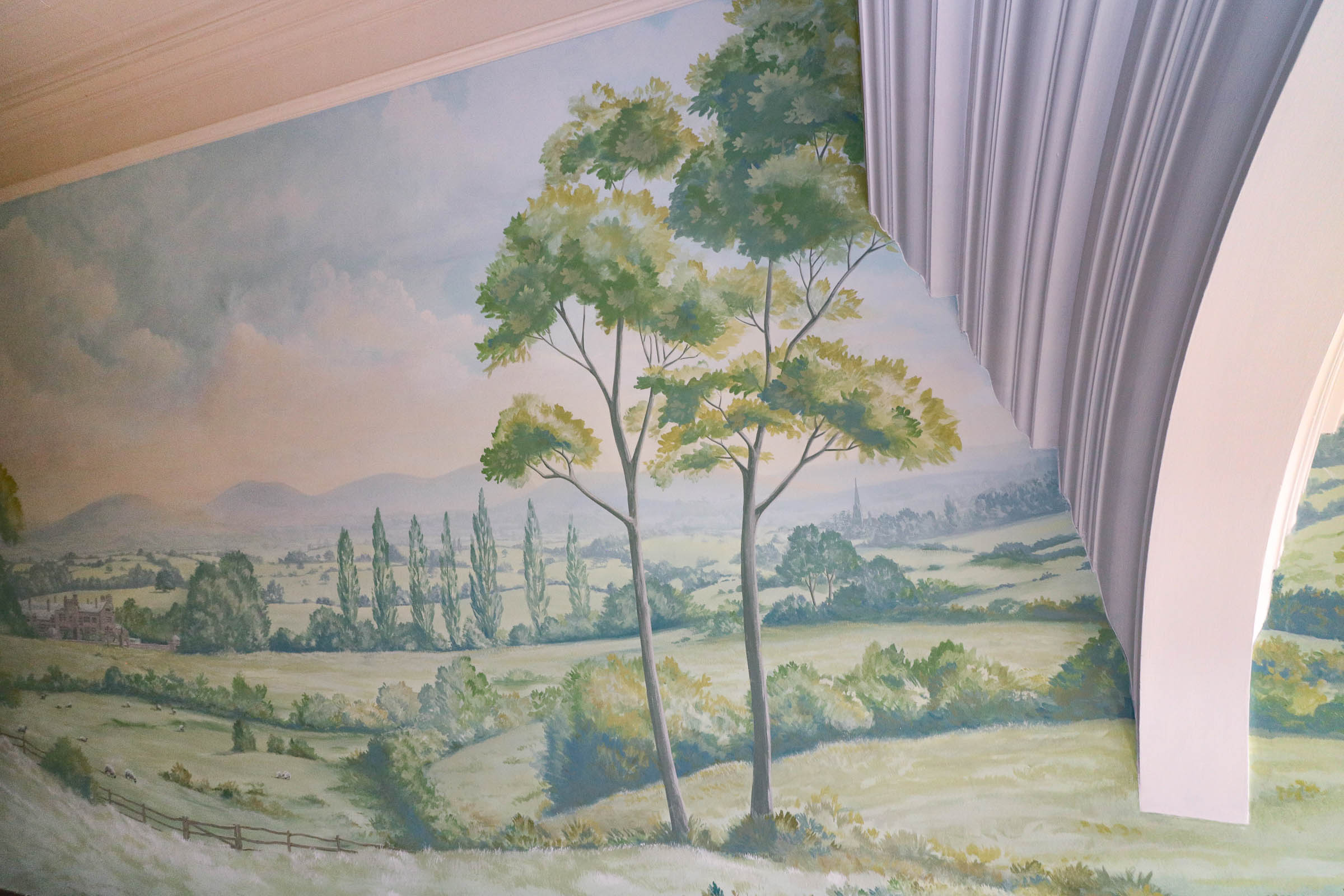 Shropshire landscape muralled in a watercolour style in a grand manor house near Shrewsbury, with a "Hogwarts Express" scene painted on the opposite wall