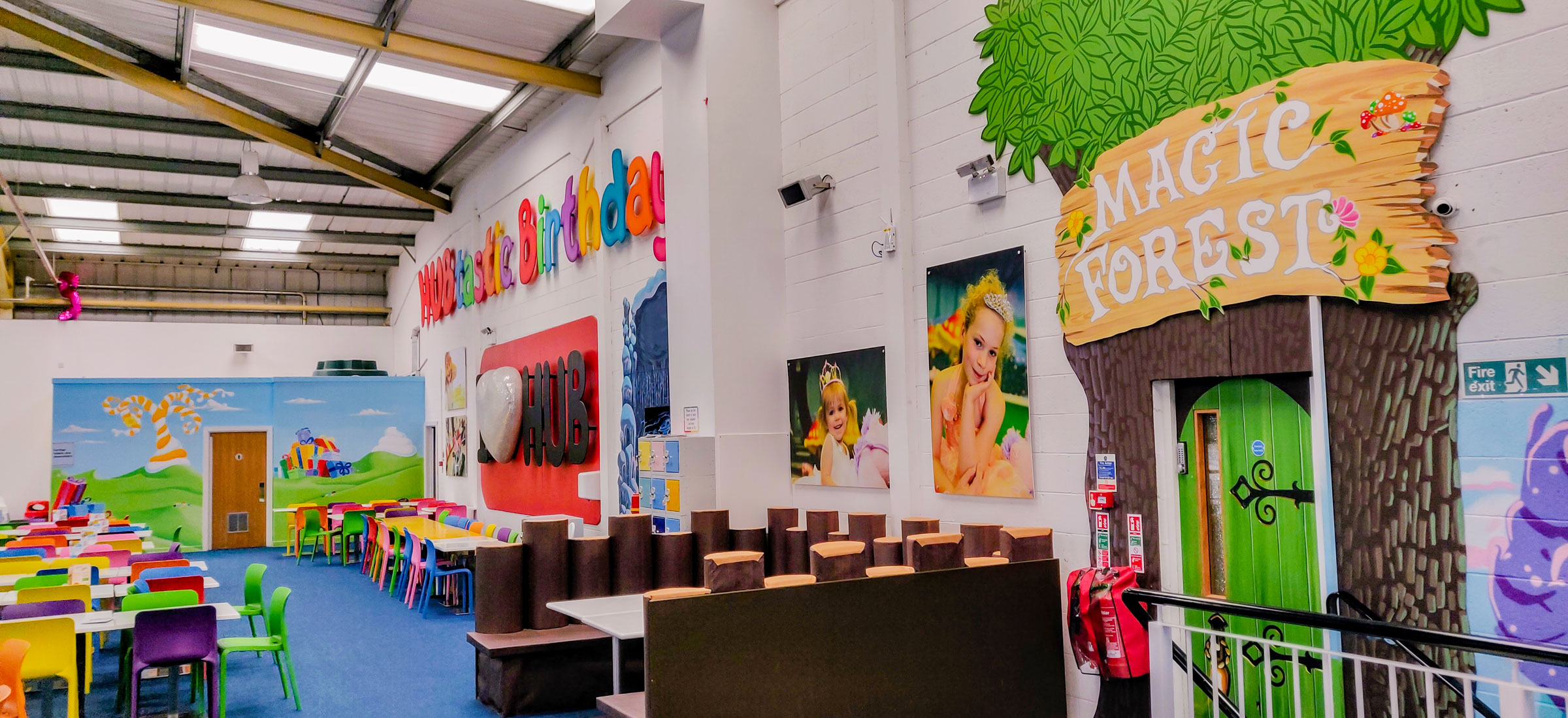 Magic Forest Party Room at the Riverside Hub, Northampton, fairy treehouses and misty magical sunset through the trees.Magic Forest Party Room at the Riverside Hub, Northampton, view from one party room to the next through the wisteria covered arch featuring the misty glowing sunset through the forest.Magic Forest Party Room at the Riverside Hub, Northampton, Main wall showing the large size of the room and mural.Magic Forest Party Room arch partition from one sideMagic Forest Party Room at the Riverside Hub, Northampton with large magical fairy tree and wisteria covered arch from the other sideMagic Forest Party Room at the Riverside Hub, with wisteria around gatewayWonderful Gateway added between the two rooms and more alterations!Again the awesome gateway between the two rooms, note the painted mdf silver birch tree trunks on the leftMagic Forest Party Room at the Riverside Hub, Northampton, original layout artwork.Magic Forest Party Room at the Riverside Hub, Northampton, Forest detail.Magic Forest Party Room at the Riverside Hub, Northampton, window in tree detail.Magic Forest Party Room at the Riverside Hub, Northampton, earlier partition.Magic Forest Party Room at the Riverside Hub, Northampton, magic door.Magic Forest Party Room at the Riverside Hub, Northampton, whole entrance with sign.Magic Forest Party Room at the Riverside Hub, Northampton, entrance from the mezzanine, view right.Magic Forest Party Room at the Riverside Hub, Northampton, entrance from the mezzanine, view left.Then one day, as if by magic, this castle appeared!A little earlier on, showing the sundial clock and balcony. Interesting use of a robotic cutting machine to cut out the castle shapes from mdf and engrave some details.Impressive castle is the latest addition to this fabulous play room at the Riverside Hub
