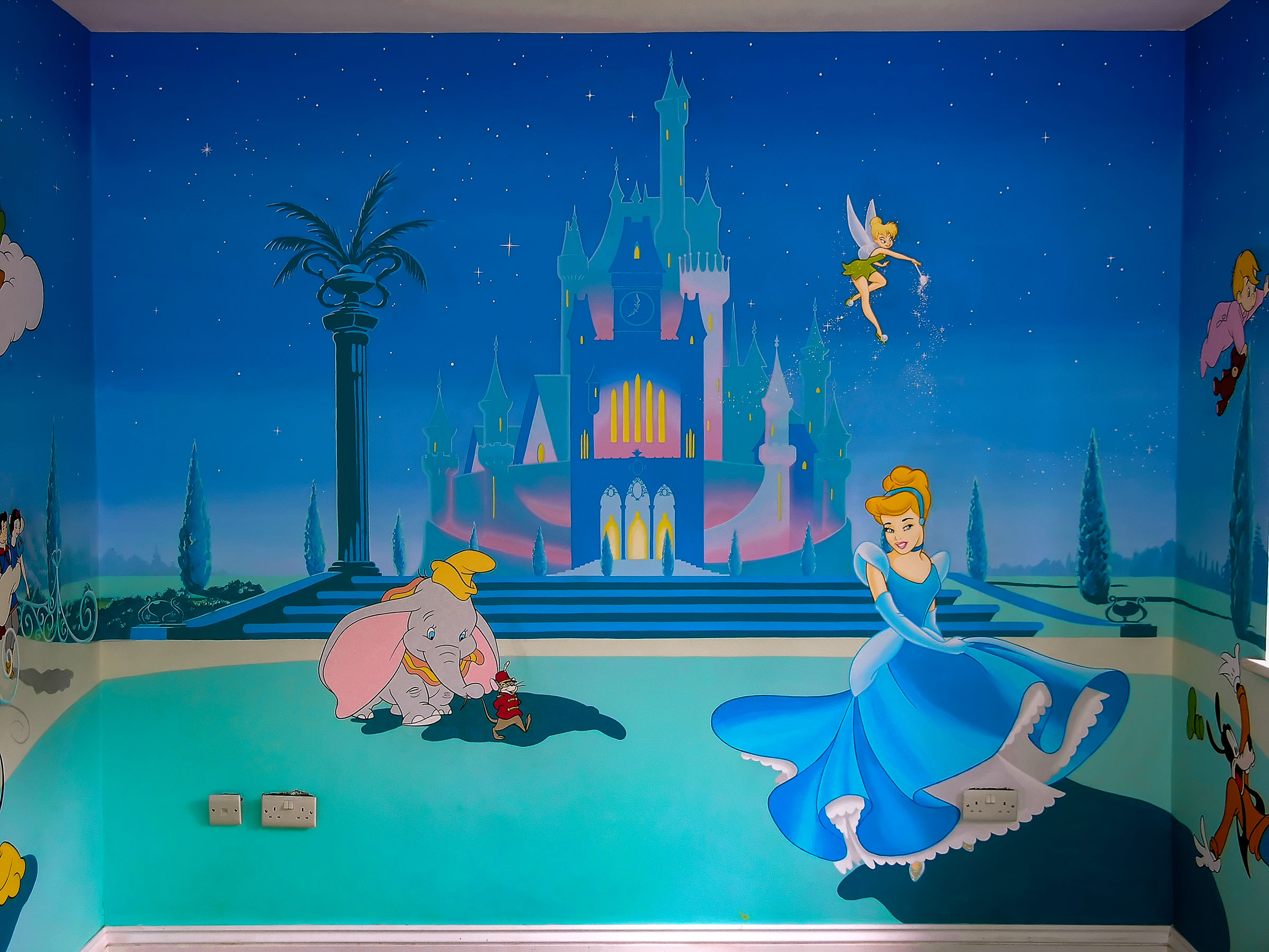 Peter Pan bedroom mural with Tinkerbell sprinkling fairy dust in front of turquoise blue disney style castleprincess murals mural Cinderella Disney Princess Castle with Tinkerbell Disney Mural (feature wall) with Princess Castle, Dumbo, Cinderella and TinkerbellPeter Pan looks down from his floating cloudCinderella Cinderella- just lovely - Showing more of the room nowLeft wall with painted door to en suite bathroom, with Pluto, Winnie the Pooh, Tigger, the Little Mermaid, and Peter PanPlus of course Snow White and her Prince Charming on the beautiful curly bridgePluto can hear somebody calling nearby, but doesn't realise it's Peter Pan up above. Pooh's knocked for six by Tigger againThe Little Mermaid sitting on a rock, combing her long red hairAround the corner of the mural, Cinderella's Pumpkin Coach over old stone bridgeNext wall, around the window, Goofy slips upPeter Pan's friends discover the magic of Fairy DustYou can fly, you can fly, you can fly!Flying off to Neverland Tinkerbell MagicI love this Disney mural with lots of the older, classic Disney characters, I hope you do too.